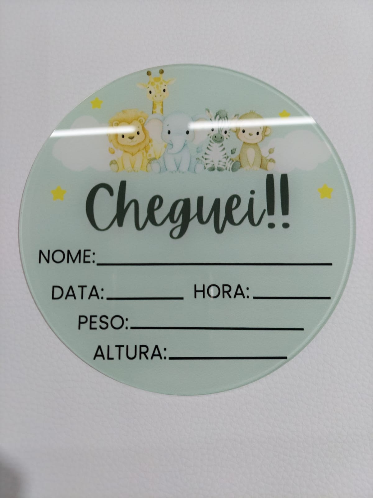 Placa em acrilico de 2mm com 14cm de diametro contendo dados para serem preenchidos, como nome, data, peso e altura - eternizando um momento especial para você guardar para sempre.